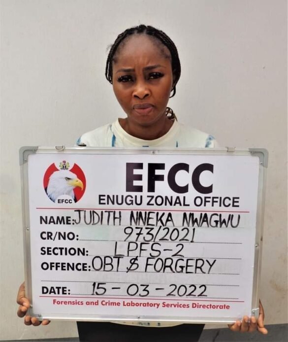 The Enugu Zonal Command of the EFCC Yesterday March 16th 2022, arraigned one Judith Nneka Nwagwu, a staff of the United Bank for Africa, before Justice D.A Onyefulu of the Anambra State High Court sitting in Onitsha on a seven count charge bordering on forgery and obtaining by false pretence to the tune of N452,047,000.